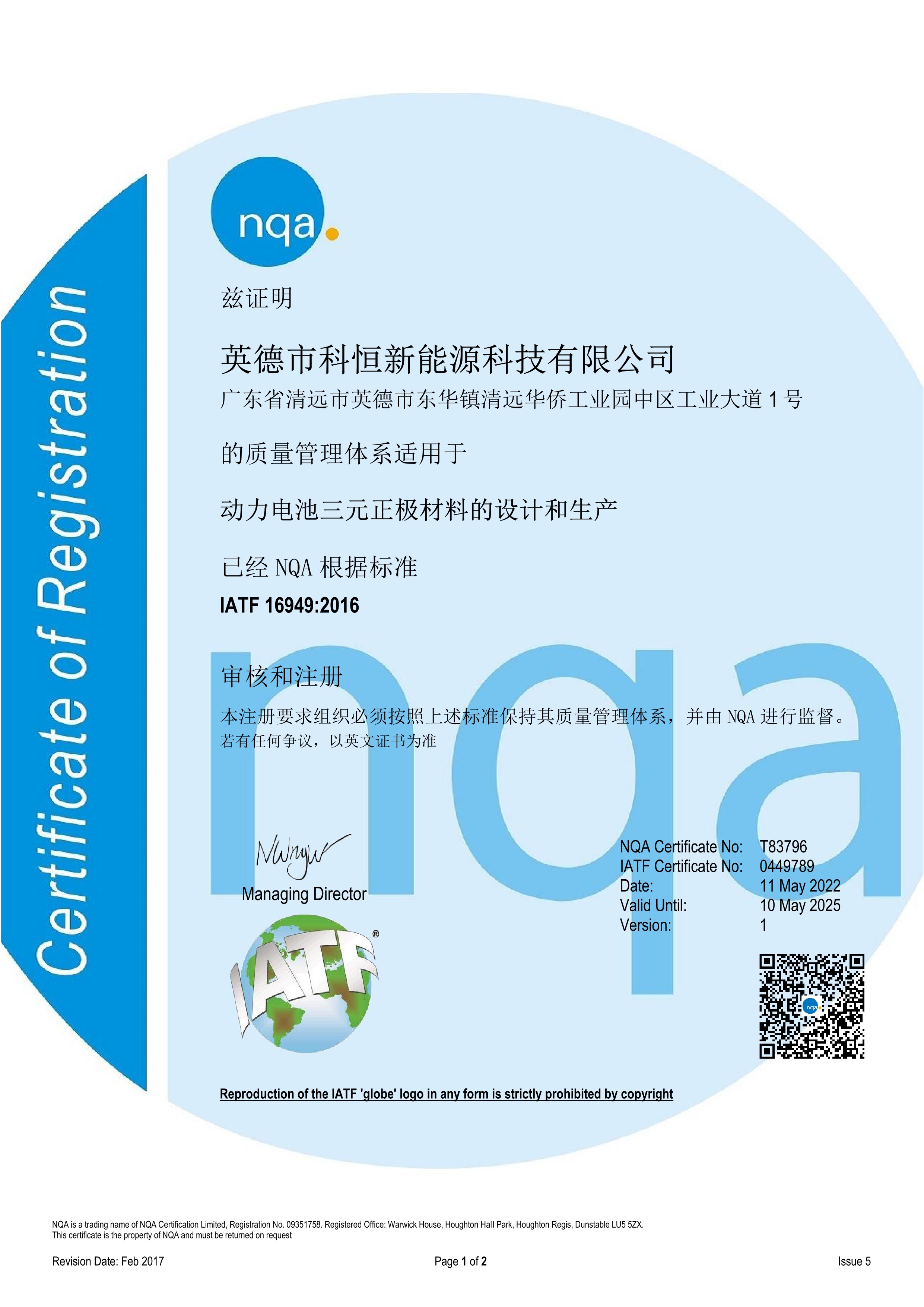 科恒堅持“科技卓越、永恒追求、質(zhì)量第一、客戶至上”的質(zhì)量方針,設(shè)立各級質(zhì)量控制體系,保證產(chǎn)品質(zhì)量。公司先后通過了ISO9001質(zhì)量管理體系認證和ISO14001環(huán)境管理體系認證。公司以滿足客戶需求為宗旨,以卓越的科技成果、完善的制造過程,制造一流的產(chǎn)品、增值的服務(wù)、共享的價值,讓客戶滿意。